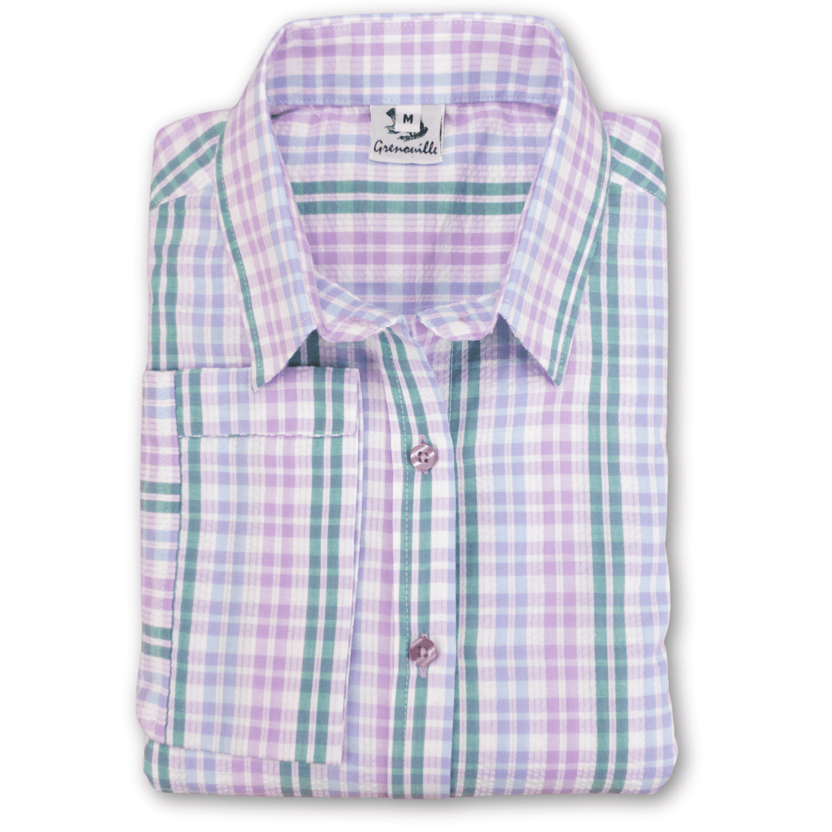 Grenouille Ladies 3/4 Sleeve Lilac, Blue and Emerald Green Check Seersucker Shirt