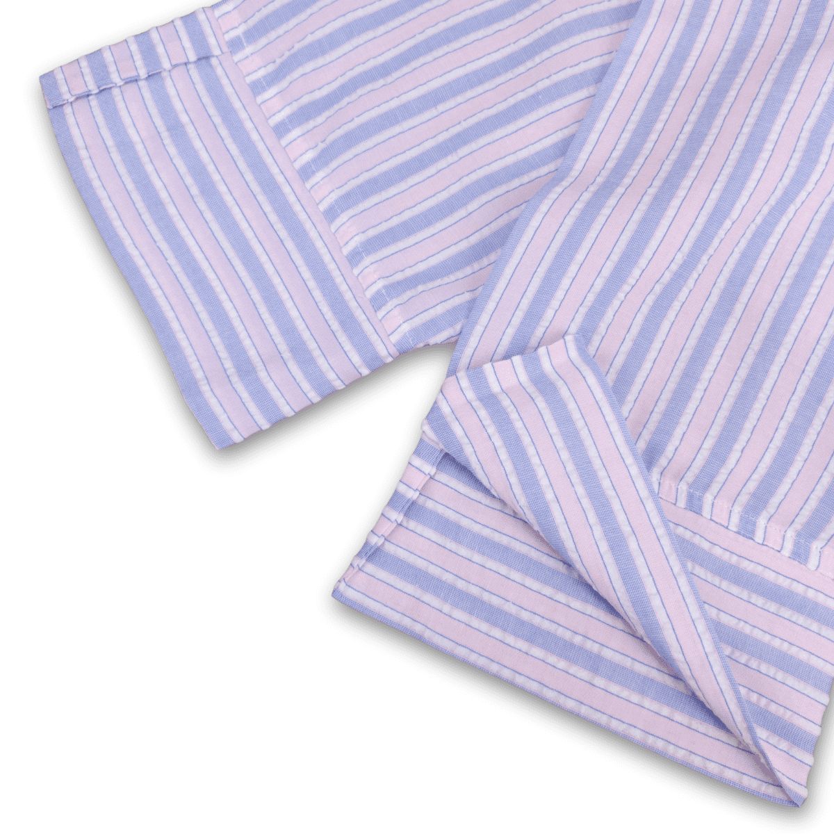 A light weight cotton rich 3/4 sleeve seersucker, in soft pretty shades of pink and blue.
