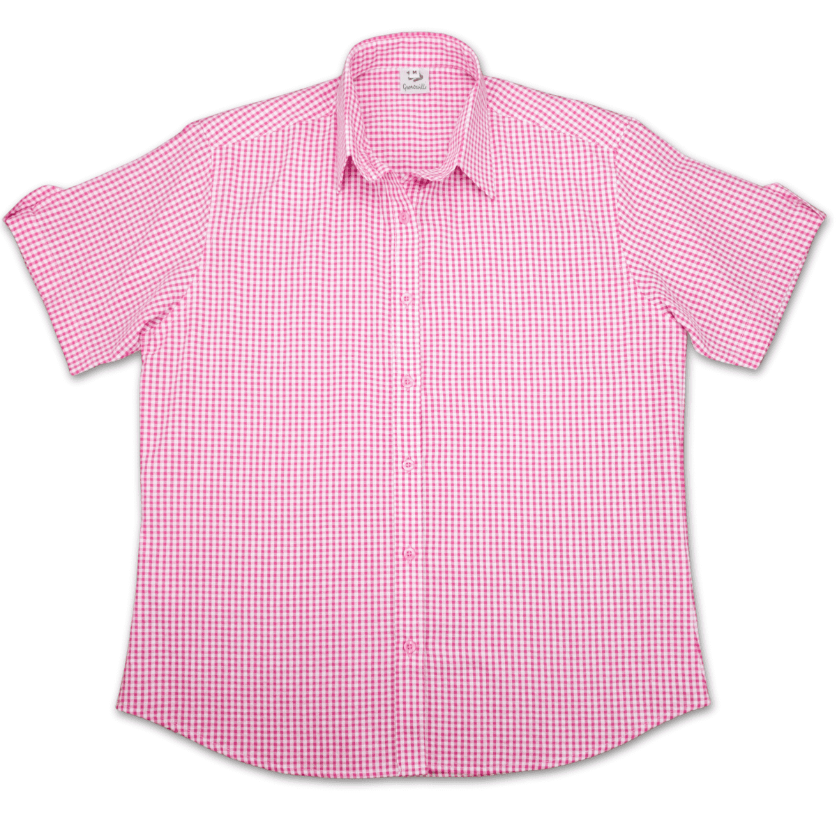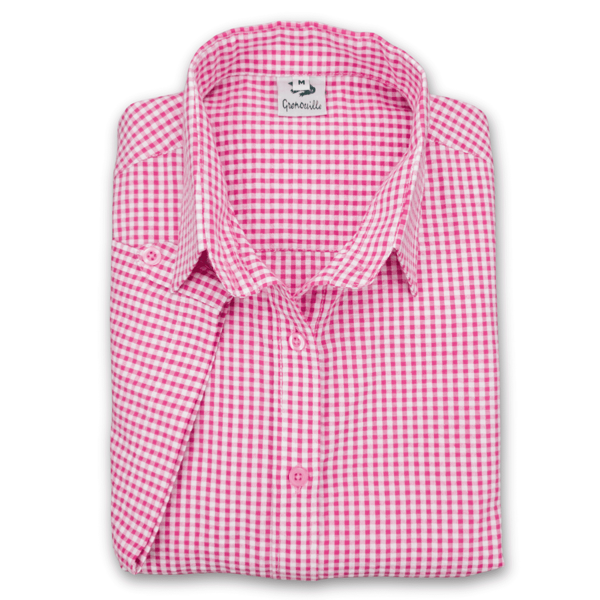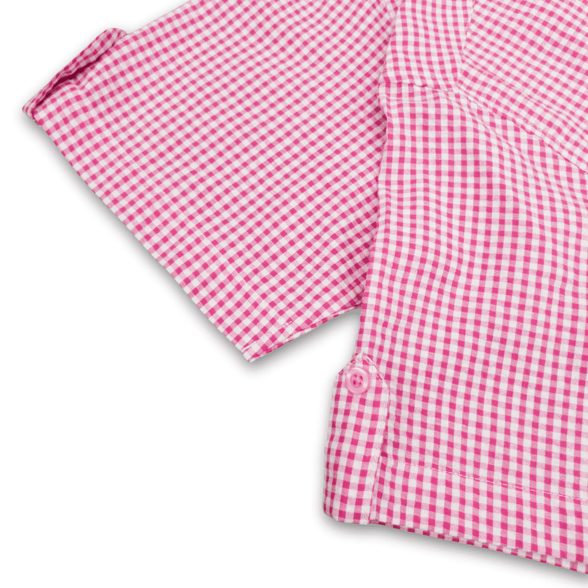 A pretty decorative tab cap sleeve seersucker shirt in a dark pink and white gingham; great for those long hot sunny days.