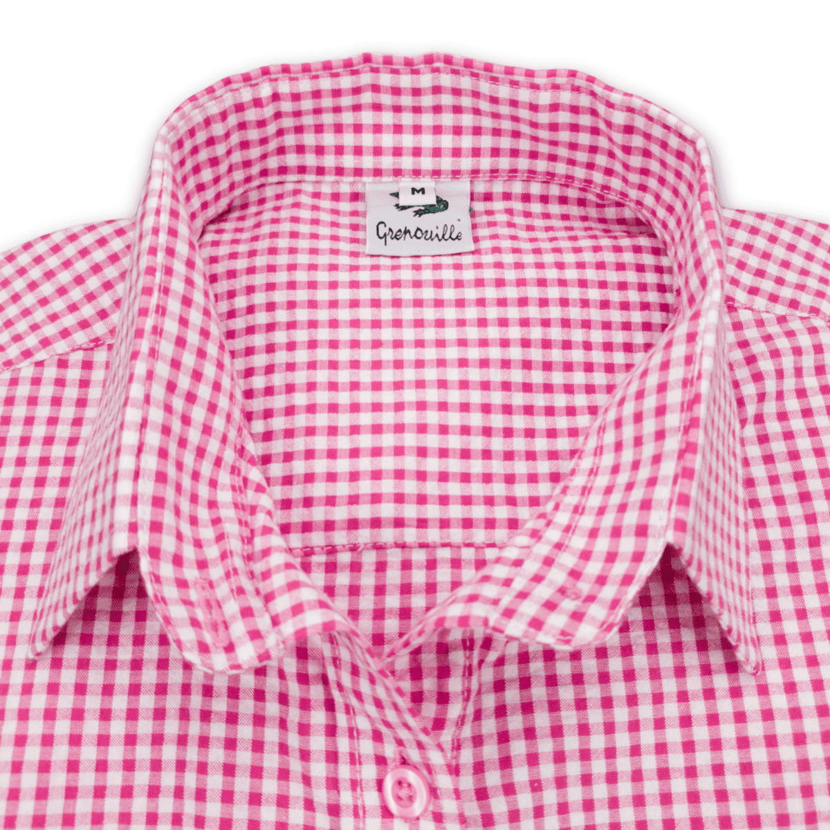 Grenouille Ladies Cap Sleeve Dark Pink and White Gingham Check Seersucker Shirt