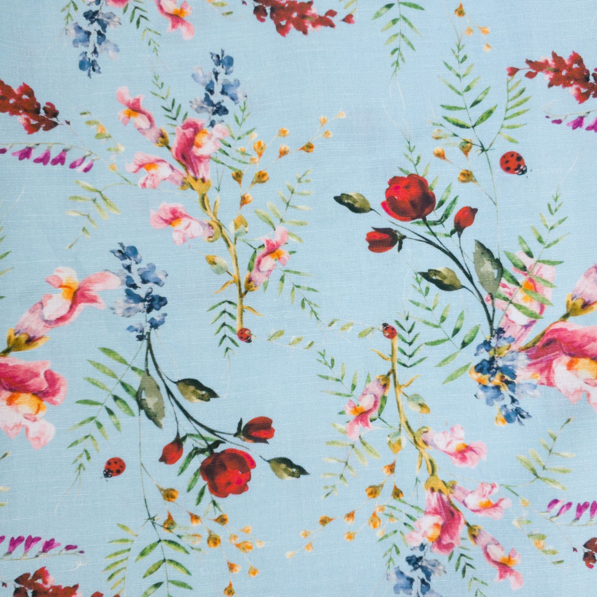 A relaxed collared loose fit / oversized blouse featuring a pretty print of red and pink flowers and red ladybird beetles on a soft blue background.