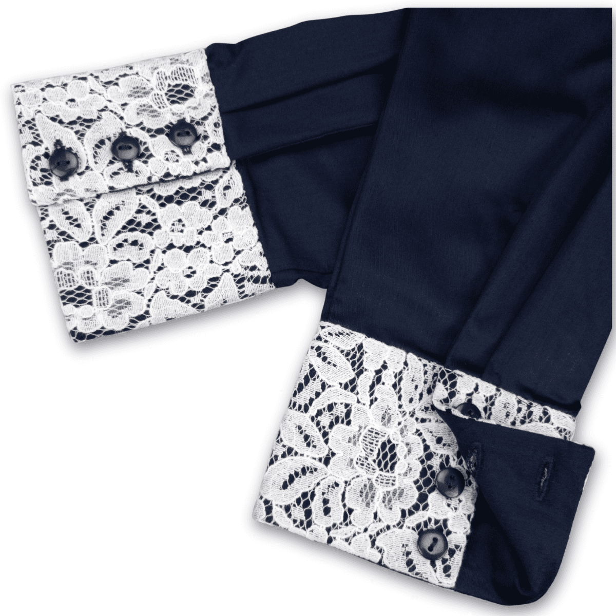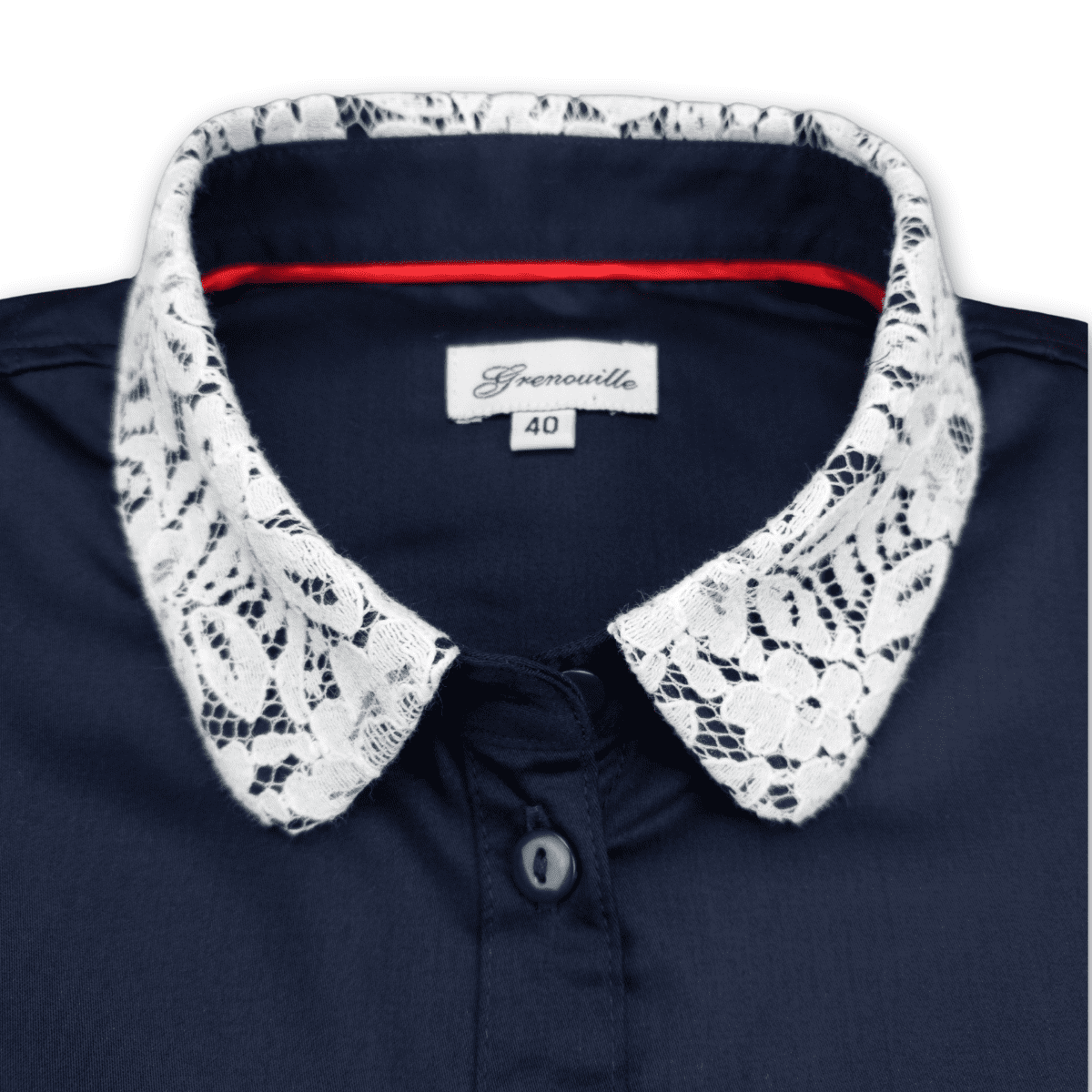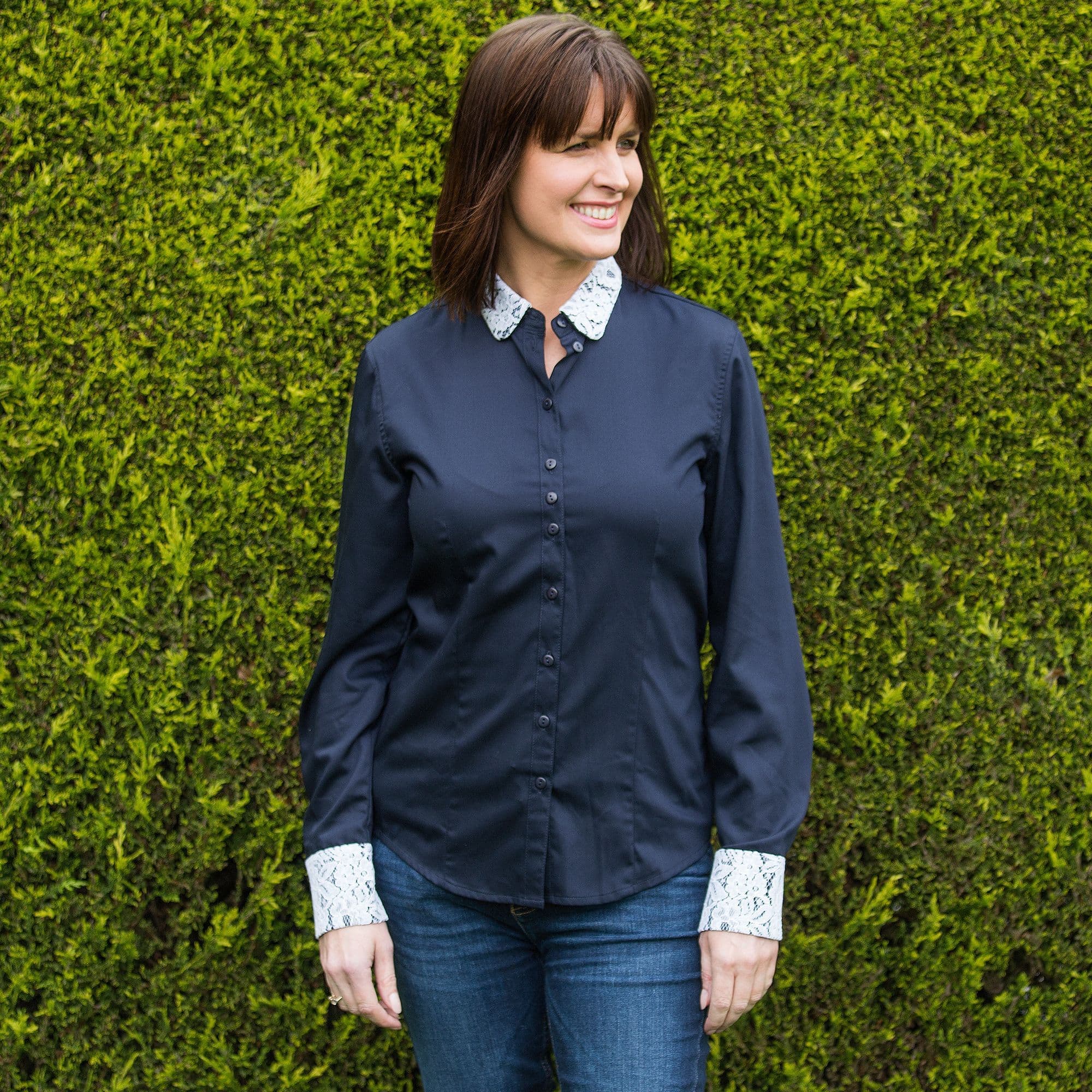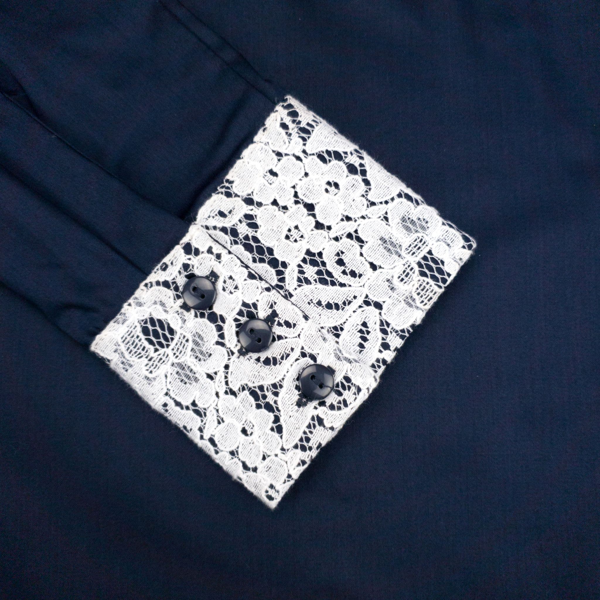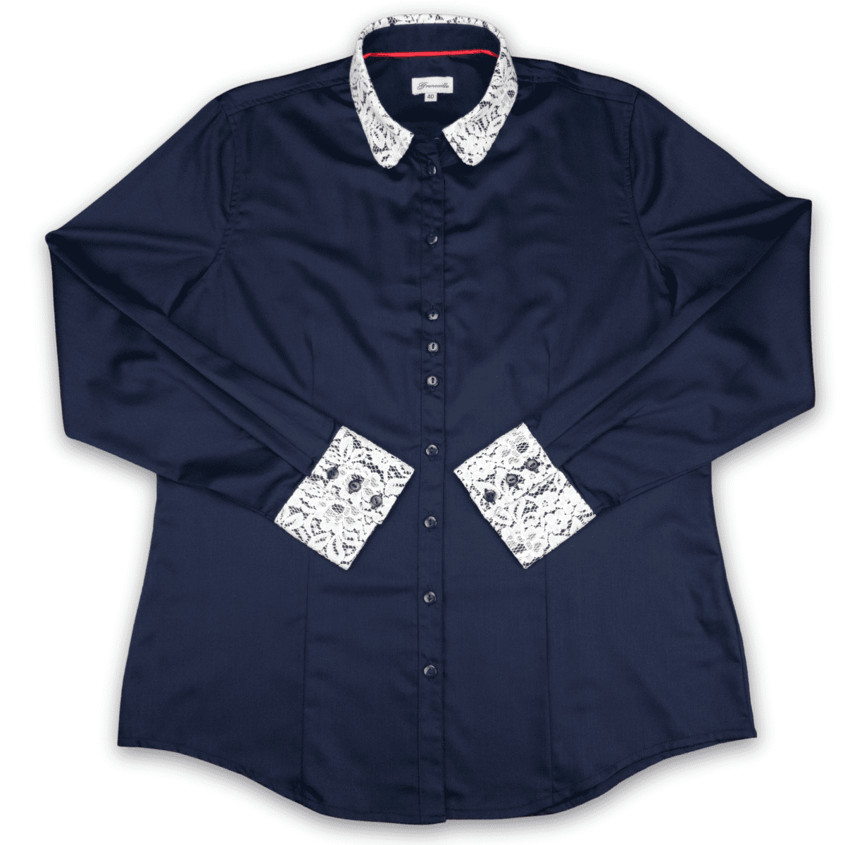 Grenouille Ladies Long Sleeve Plain Navy Bamboo Silk Blouse with White Lace Detail