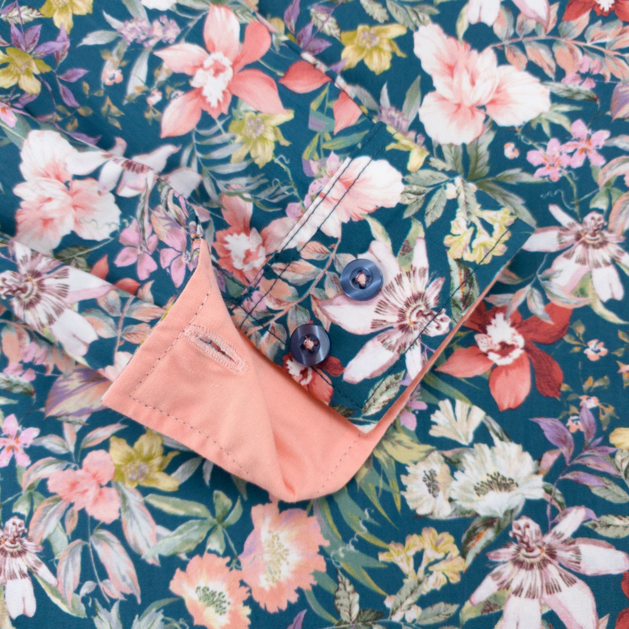 Passion flowers and orchids in beautiful soft peach shades on a deep teal background come together for this spectacular shaped fit shirt.