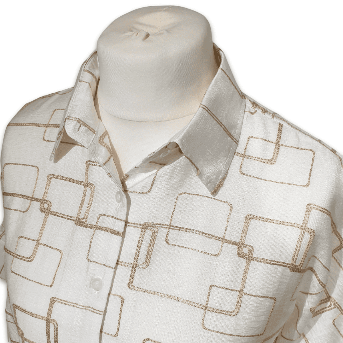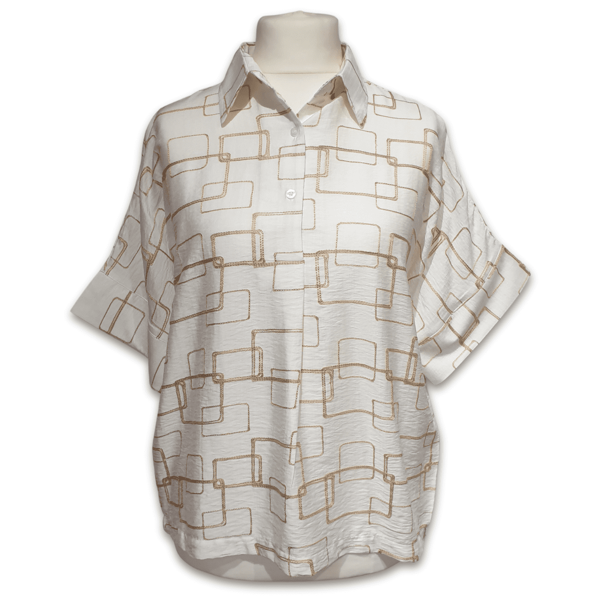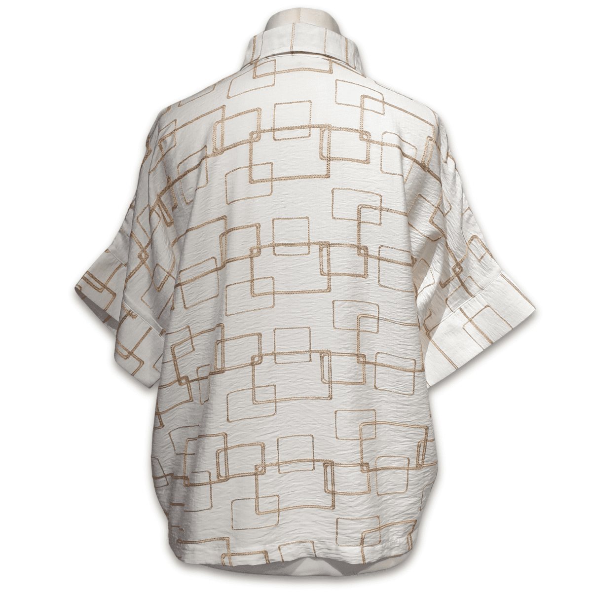 A smart, yet casual batwing style top in a fabulous natural white rayon featuring a gold colour chain stitch overlapping square design.