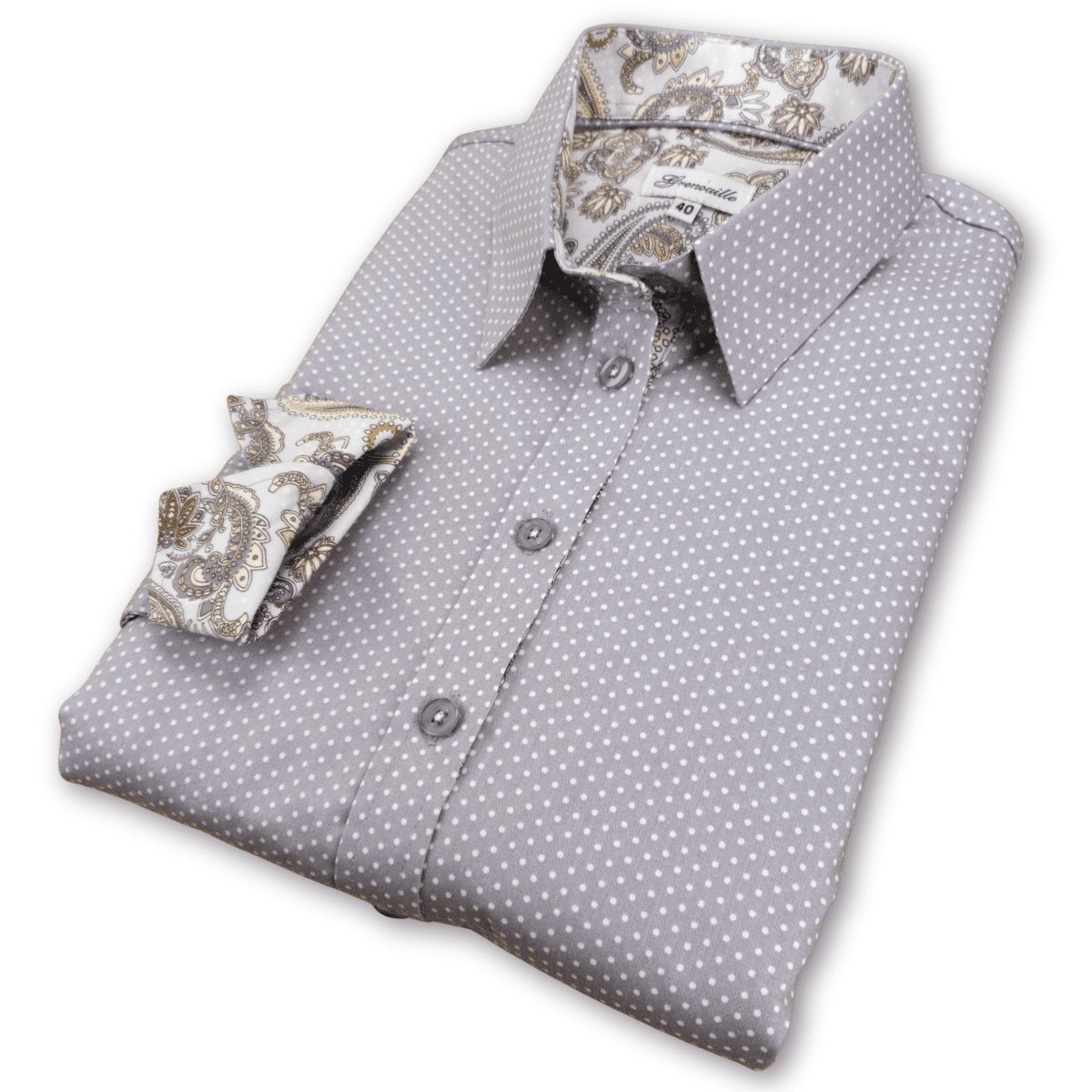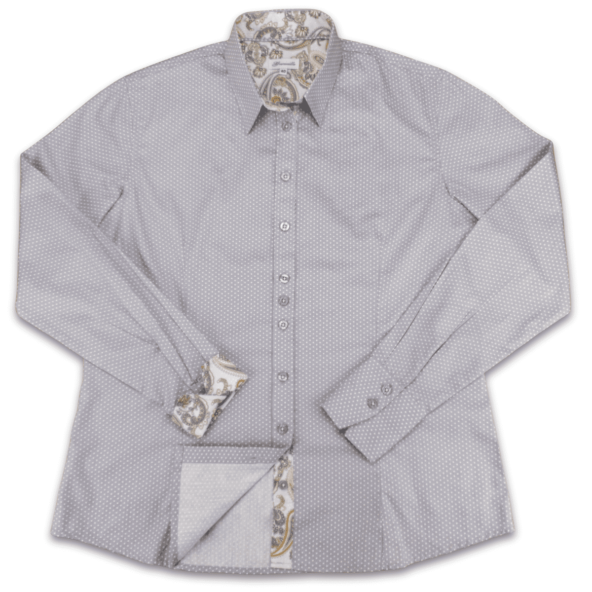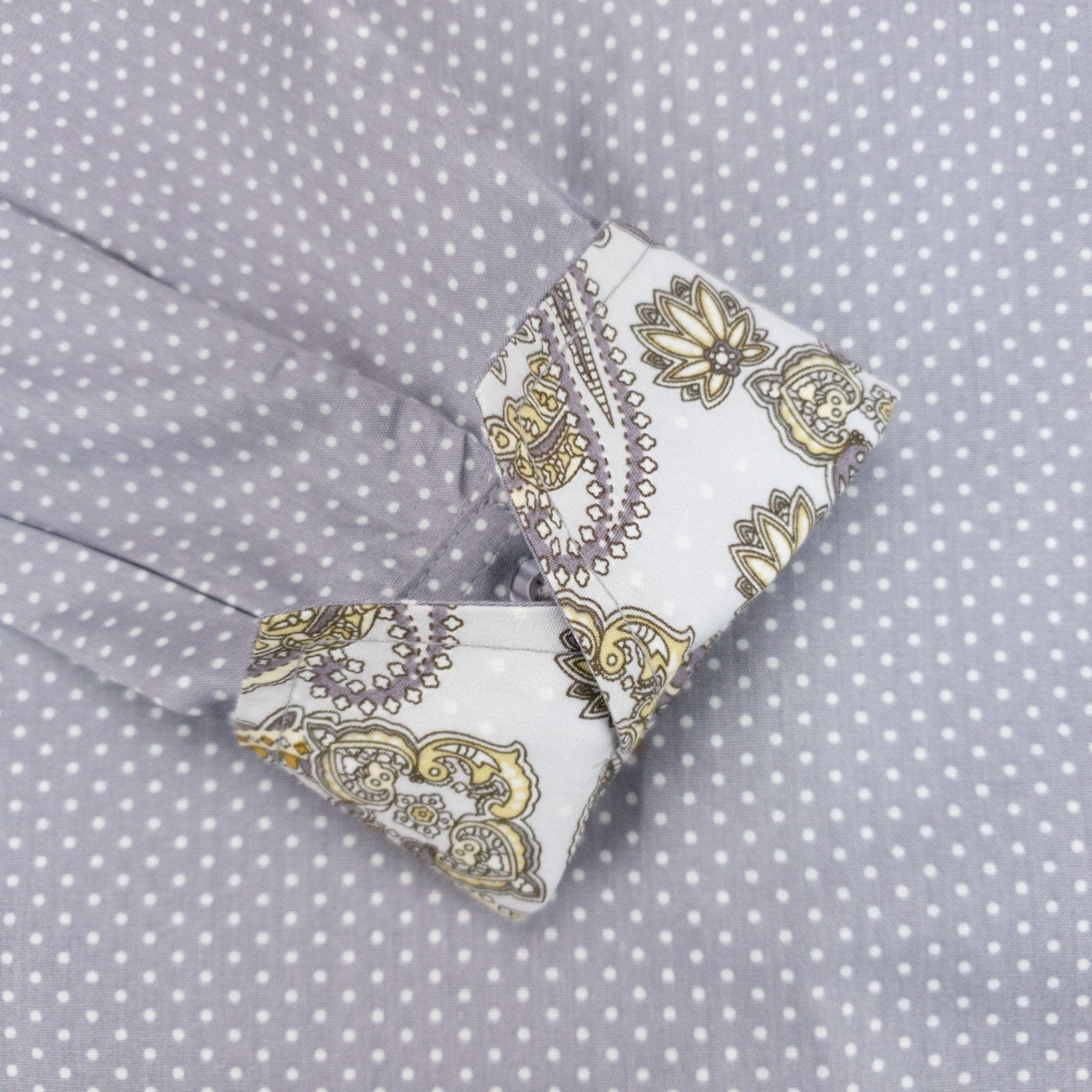 A stylish silver grey and white polka dot shirt, accented with a smart grey and cream paisley design.