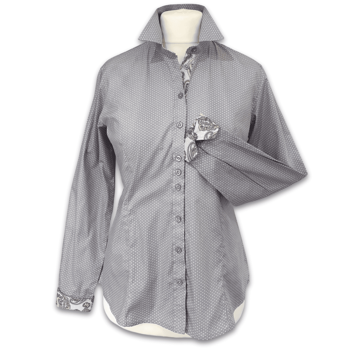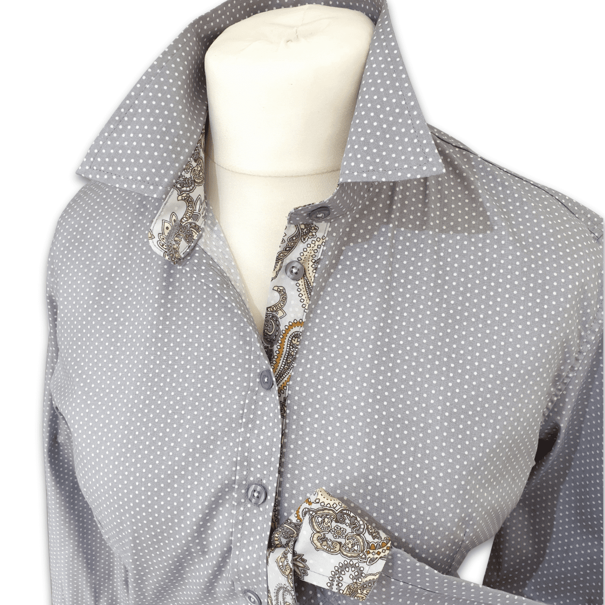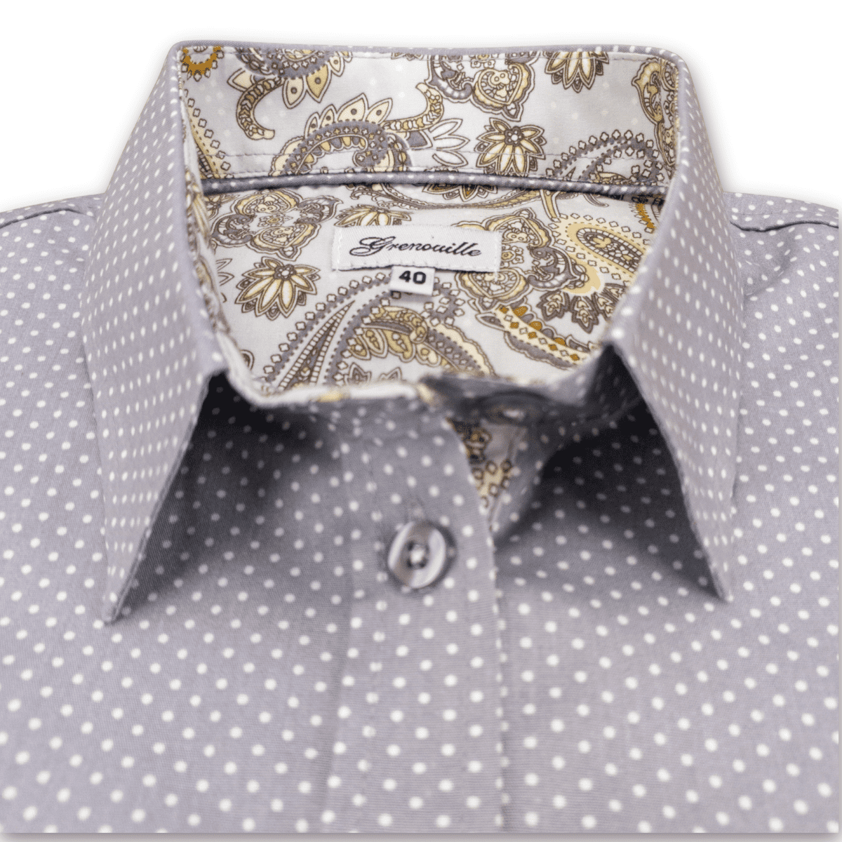 A stylish silver grey and white polka dot shirt, accented with a smart grey and cream paisley design.