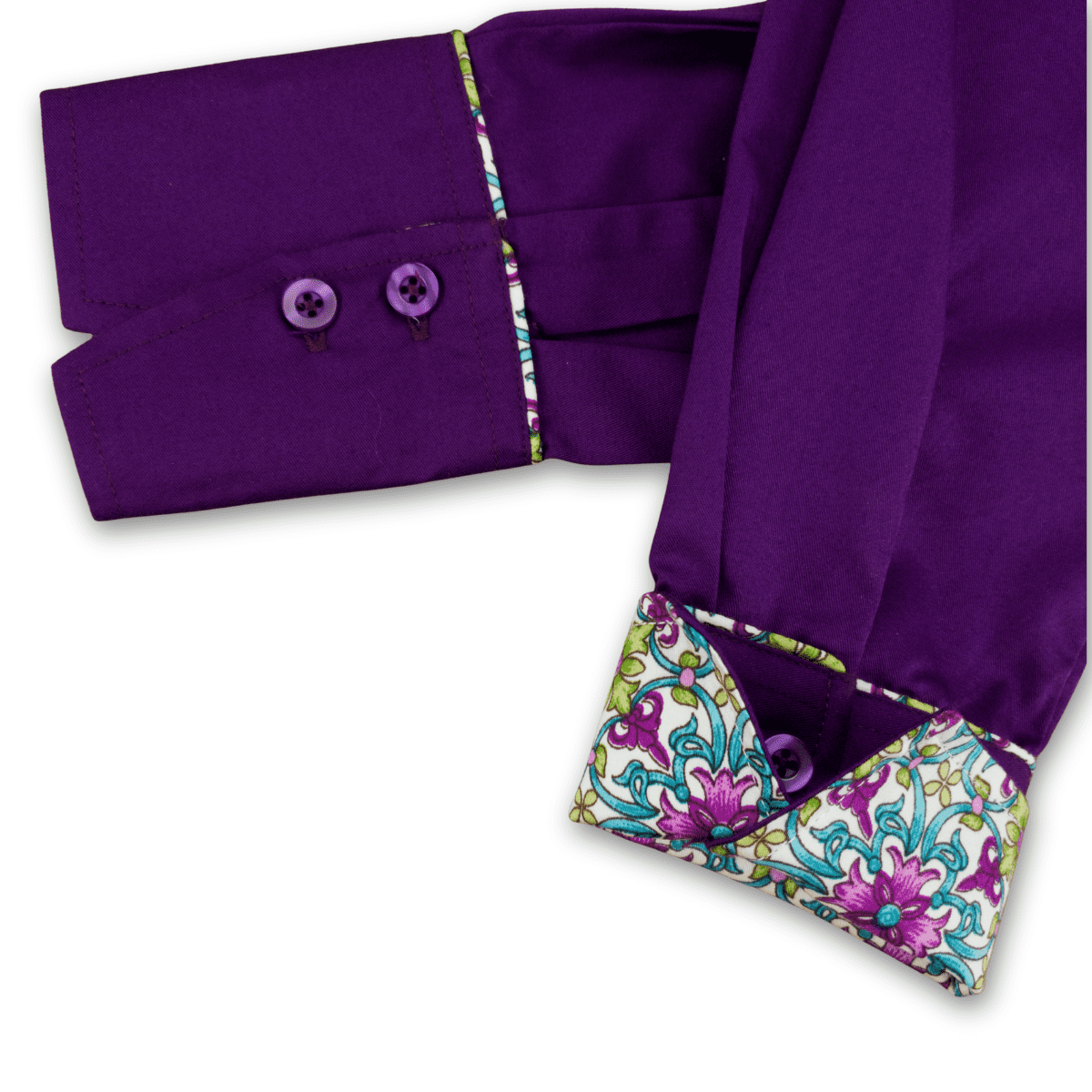 A majestic deep purple cotton twill shirt accented with an equally spectacular , cream, turquoise, purple and green Mughal pattern style print.