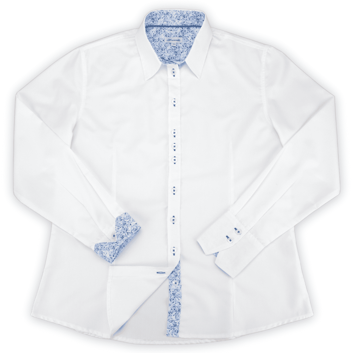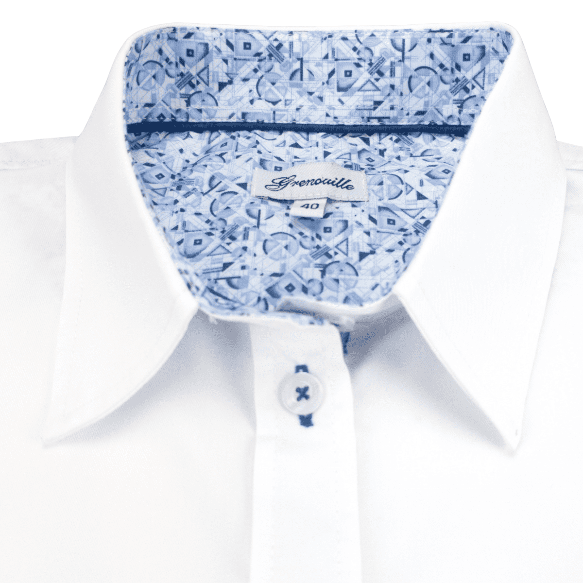 A fresh looking white micro twill fabric shirt, accented with an abstract blue pattern print.