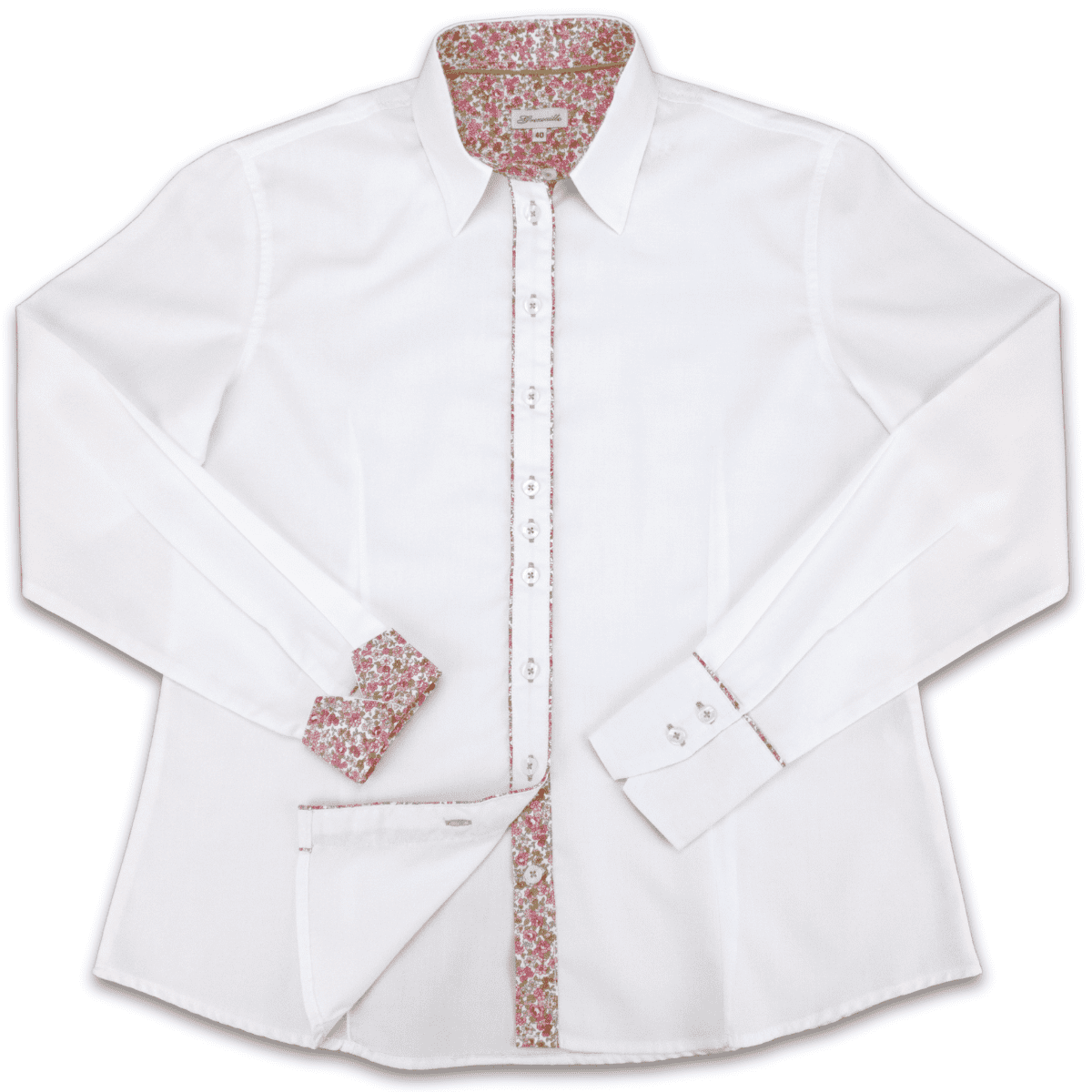 A smart looking white royal oxford weave shirt accented with a Liberty style retro pink, orange and green floral design.